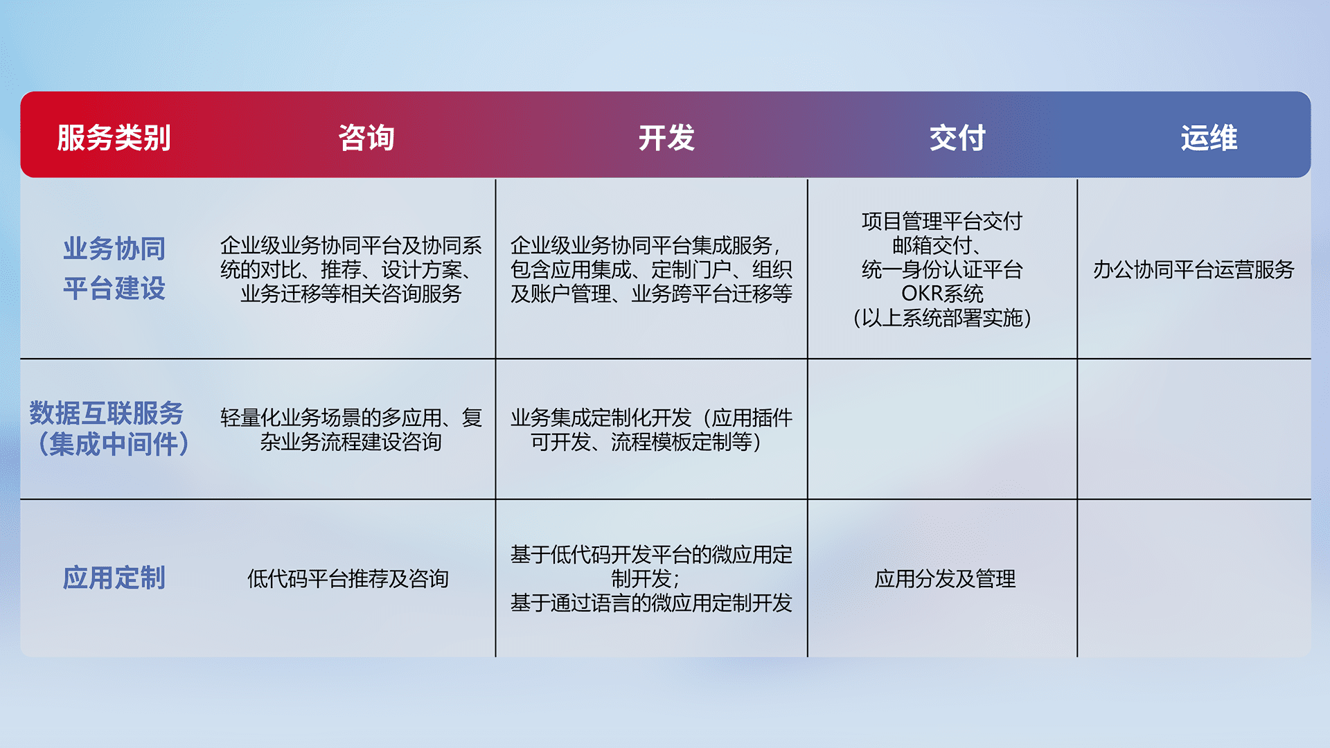 针对钉钉、、、企微、、、、IDaas等平台级产品提供产品的规划、、方案、、交付、、、、定制化开发等服务,,,实现如统一协同办公、、、智能客户服务、、混合会议管理、、、智能数据查询、、、、等业务场景,,实现数字化转型。。